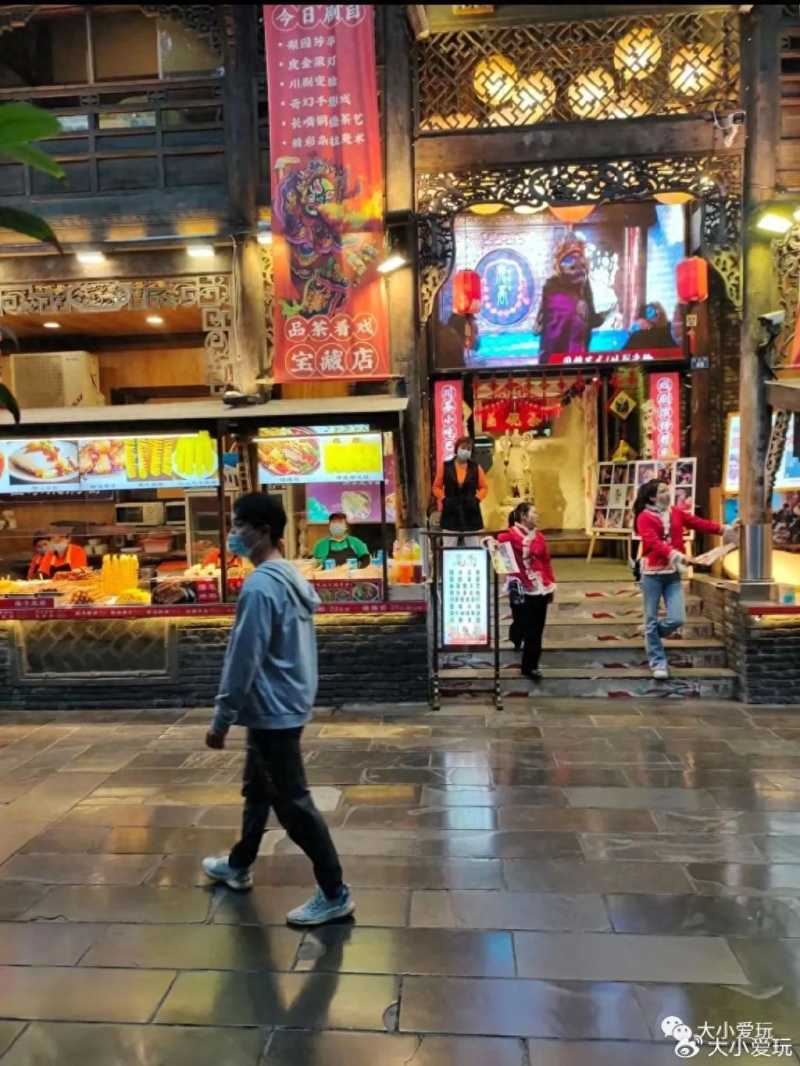 这里道路两旁全是小吃店、纪念品店。纪念品没什么特色,大多是一眼就能看出义乌批量产品,卖的很贵;至于小吃,打着成都特色小吃的招牌,但价格都会比外面贵很多,有些甚至是翻倍的价格。