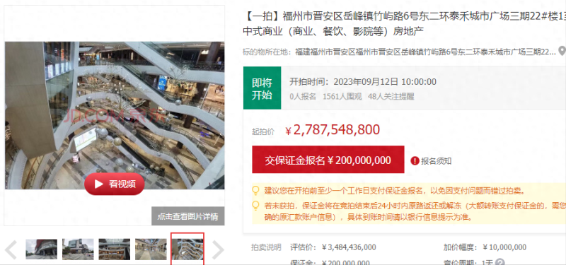这样的商业巨子,如今却面临着被挂牌拍卖的结局。8月10日,京东法拍网上架了东二环泰禾城市广场三期22#楼1至7层01集中式商业(商业、餐饮、影院等)房地产,建筑面积约11.9万㎡。而这正是福州人熟悉的东二环泰禾广场购物中心的部分,挂牌价27.8亿元。