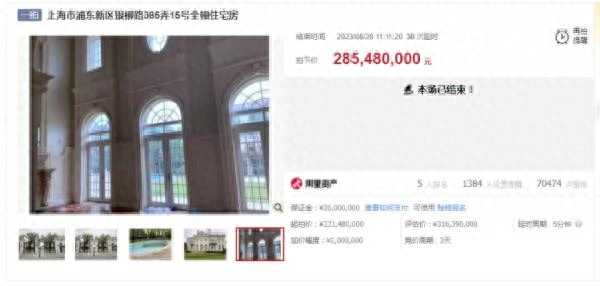 2023年8月25日至8月28日,上海市浦东新区人民法院在某宝网上,对上海市浦东新区银柳路385弄15号全幢住宅,进行公开司法拍卖,建筑面积1300.84平方米,起拍价2.2148亿元,相当于评估价3.1639亿元的7折。