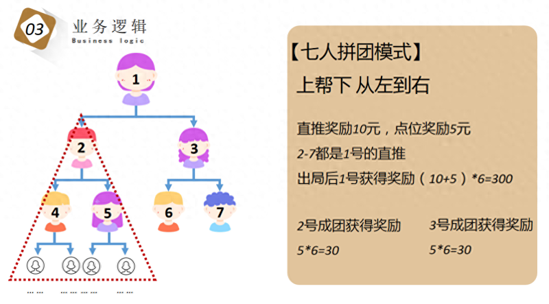 他是有2个奖励机制一个是直推奖励,另一个是点位奖励,直推奖励设为10元,点位奖励设为5元,7人为一团,呢么每出一次团他最低都可以获得30(5*6)元,如果全是他推荐的那么他最高可以获得60+30=90(10*6+5*6)元,这个模式是采用公排机制进行排列的,系统根据从左往右从上往下,直推优先的条件进行排列。