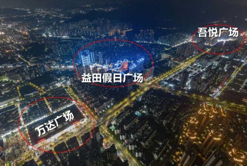 首先来看看大亚湾。这是一个经济技术开发区,也是惠州市南部新发展起来的区域,各方面配套都是近几年发展而成。目前的大型商业体有“益田假日广场”、“大亚湾万达广场”和“吾悦广场”,他们这三座形成了大亚湾“三足鼎立”的铁三角商业体,而且三大商业体的具体非常近,如下图: