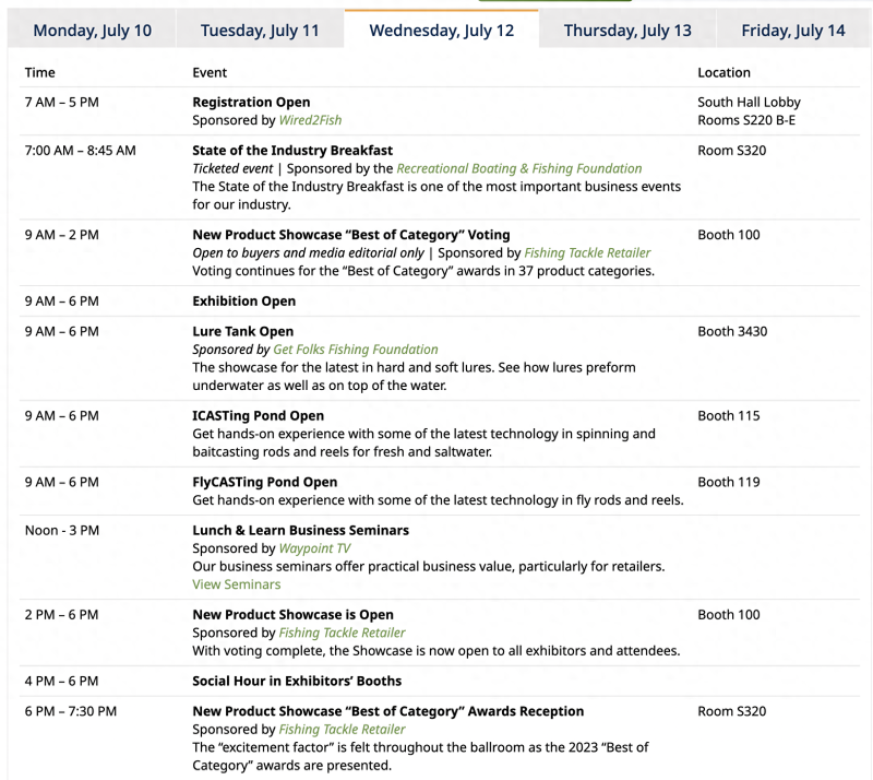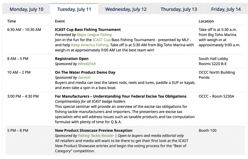展会形式推陈出新、丰富多彩,集合赛事ICAST Cup Bass Fishing Tournament、产品试用On the Water Product Demo、钓鱼普及、行业研讨会、政策解读。