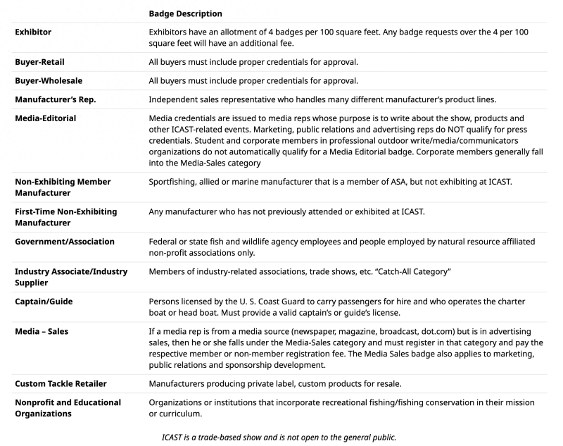 展会链接庞大参与者:职业钓手、休闲钓友、管理钓场、船长Captain、钓鱼导游Guide、钓鱼零售商Retail、钓鱼批发商Wholesale、钓具制造商、船舶制造商、垂钓媒体Media、垂钓协会Association、政府垂钓管理部门Government、和垂钓相关非盈利性组织。