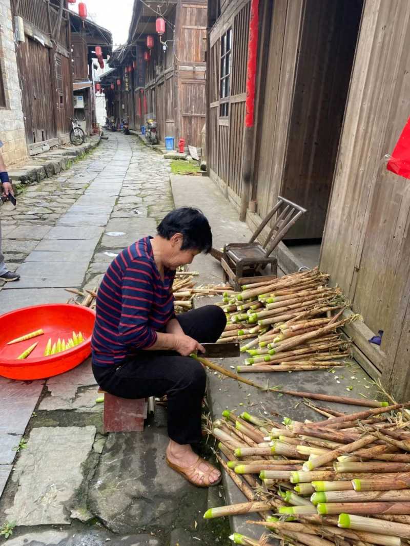 这种传统的制作豆腐的工艺让我们很感兴趣。豆腐坊的老板娘叫陈新军。她看起来阳光开朗。老街上并没有足够的人来买豆腐,大多数的豆腐都是通过“六姑娘”在网上售卖。“六姑娘”今年三十出头,在抖音做主播。她在古街上开了直播室,向人们推广安化黑茶、腊肉,以及各种山货。