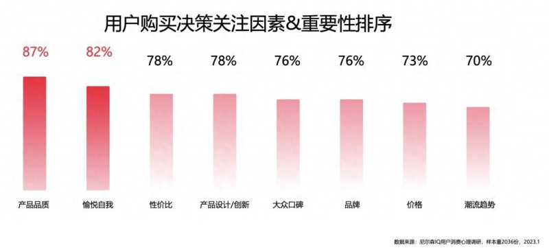根据2023《麦肯锡中国消费者报告》,如今的中国消费市场中,消费降级其实并未发生,但消费者会努力寻找价格更具竞争力的渠道来购买品牌和产品。今年年初小红书与尼尔森合作发布的《后疫情时代消费心理研究报告》中,通过对小红书用户消费行为的洞察,发现在产品极大丰富时,消费者决策逻辑发生了显著变化,他们会审慎地通过不同维度来权衡,比如产品品质、情绪价值、性价比等,认同“产品要兼顾使用价值与情绪价值”的消费观。简言之,消费者在花钱这件事情上变得更为谨慎,同时需求也变得更为多元。