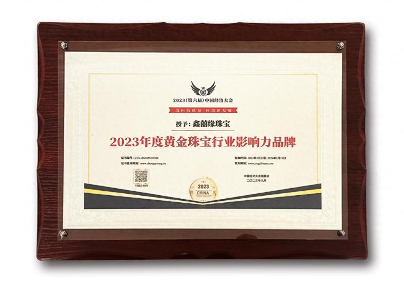 在本次大会中,德诚珠宝集团旗下国潮文化喜事黄金品牌——鑫囍缘珠宝,依托集团强大的产业优势,荣获“2023年度黄金珠宝行业影响力品牌”奖。