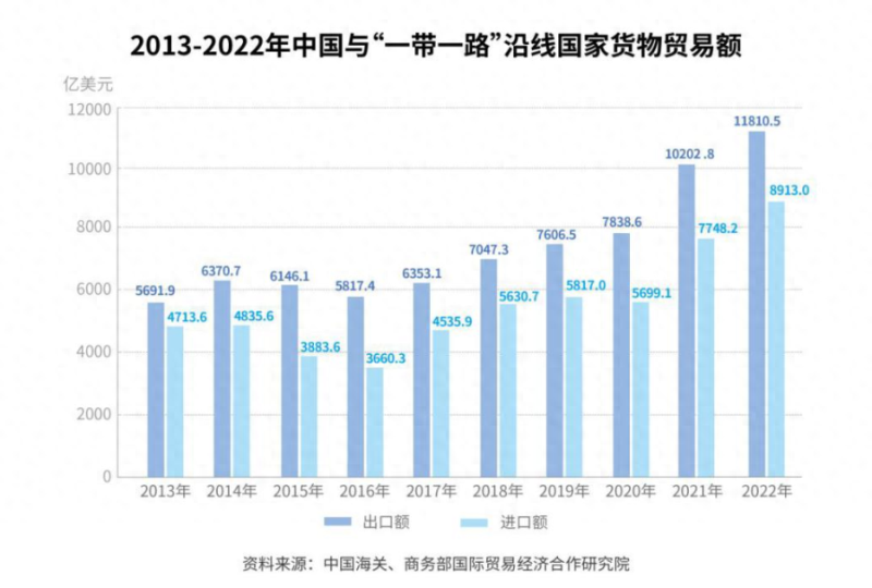 2013年至2022年,中国与“一带一路”沿线国家货物贸易额从1.04万亿美元扩大到2.07万亿美元,年均增长8%。未来共建“一带一路”通过降低关税,带动交易成本、跨境物流成本以及制度成本的降低,加快“一带一路”沿线国家标准、规则、法规对接,打造“大通关体制”,从而有望实现“软联通”。[14]