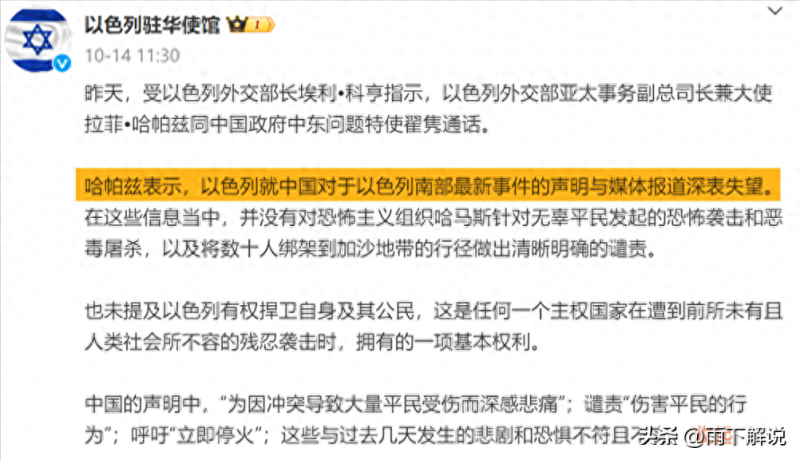 因为以色列的各种行动,巴勒斯坦的平民遭受了巨大的伤害,中国呼吁双方暂时放下战争,用和平的方式解决问题。没想到中国呼吁双方克制的话却遭到了以色列的不满,什么情况?