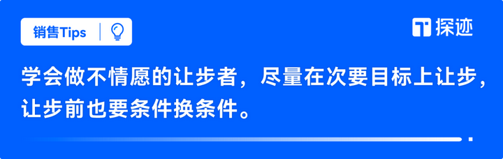 如果实在要让,也尽量双方一起让。一方面你因此获得一些回报,例如让客户介绍一个准客户;另一方面,可以提升让步的价值。当你提出一个新的条件,对方要么答应你的条件,要么就只能撤掉自己刚才那个条件。