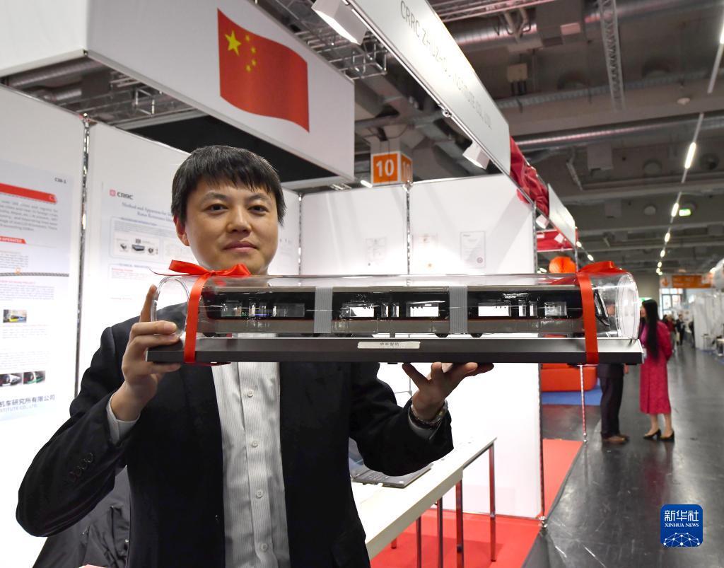 10月28日,在德国纽伦堡,中车株洲电力机车研究所有限公司工作人员展示一款智能轨道快运列车模型。智能轨道快运系统无需铺设物理轨道,地面画有白色虚拟轨道,车辆借助轨迹跟随等技术行驶。新华社记者 任鹏飞 摄