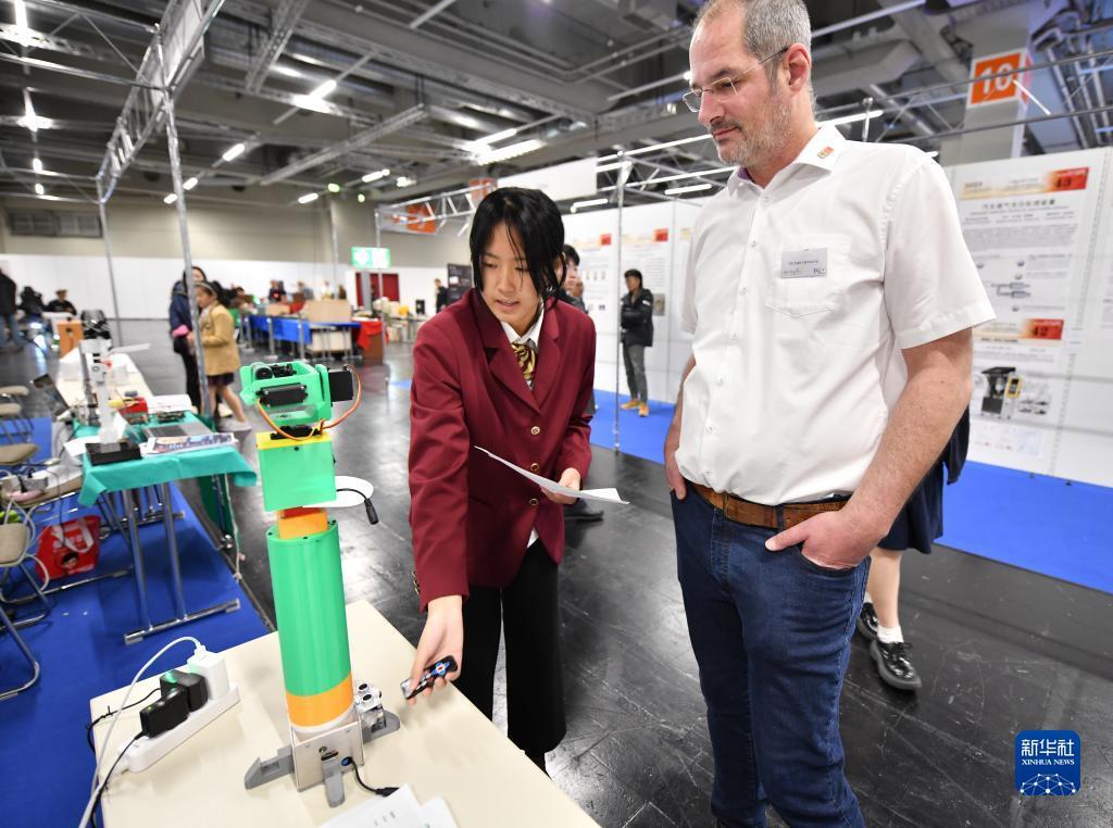 10月28日,在德国纽伦堡,一名北京市第八十中学的学生向参观者介绍一款自稳定三脚架模型。新华社记者 任鹏飞 摄