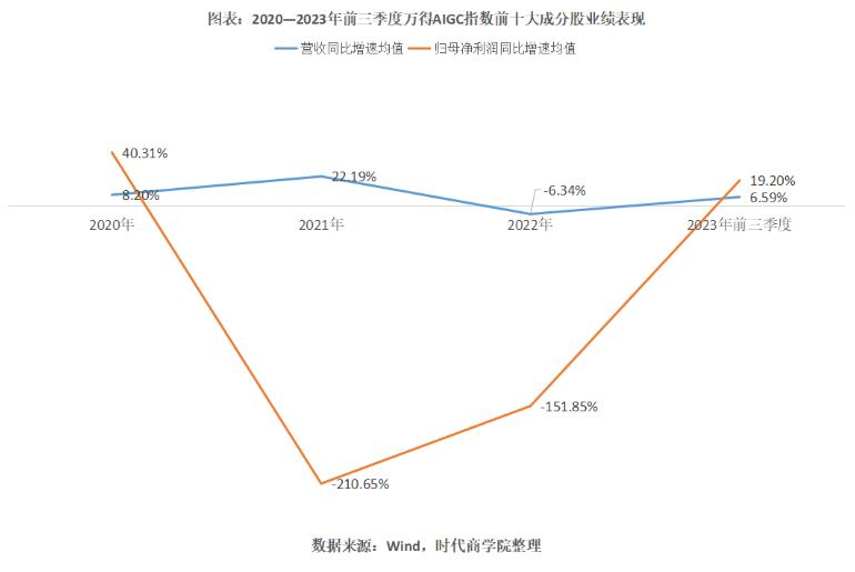 然而,A股AIGC概念股大涨背后,个股普遍缺乏扎实的业绩支撑。Wind数据显示,2020—2022年,AIGC指数成分股的总营收同比增速分别为-8.18%、9.37%、-2.67%,归母净利润总额的同比增速分别为-34.13%、123.41%、-209.38%,波动较大。