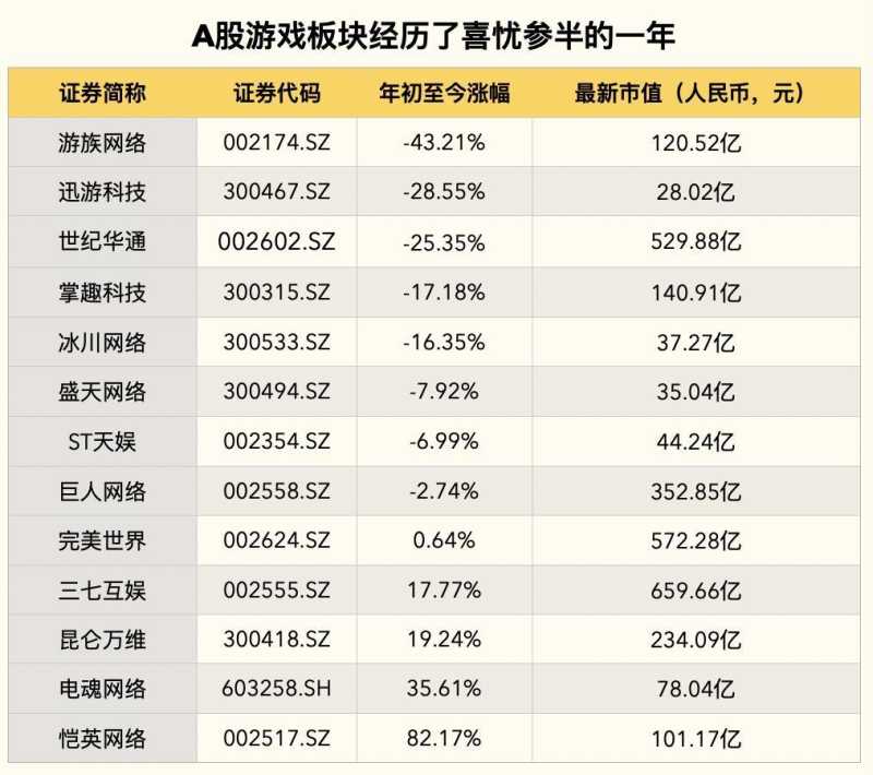 A股13只游戏股中,8只股价2020年涨幅为负。时代财经制图