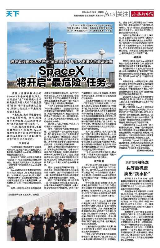 进行首次商业太空行走,刷新近几十年来人类抵达的最高高度 SpaceX 将开启“最危险”任务
