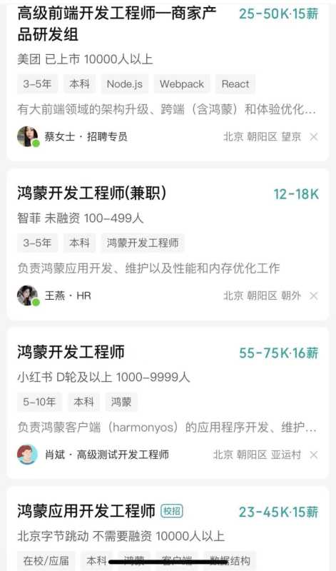 在BOSS直聘等招聘平台,小红书、字节跳动、微博、百度等厂商仍然挂有鸿蒙软件开发工程师的招聘,月薪在30K至60K不等。