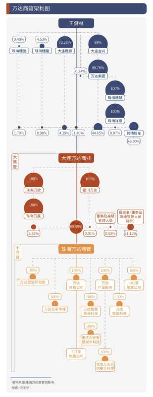 2015年开始,万达开启了“向轻资产转型”的征程,经过复杂的股权变化,王健林实现了通过万达集团控制大连万达商管,再控制珠海万达商管的多层股权控制关系。