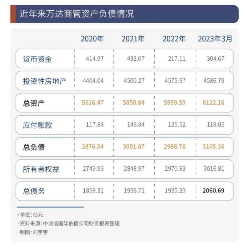 根据中诚信国际整理的万达财报,截至2023年3月,万达商管持有货币资金305亿元,总资产6122亿元,其中投资性房产4587亿元。总负债3105亿元。