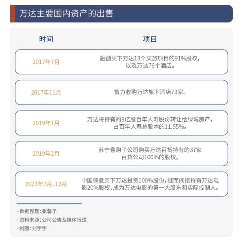 但从2017年开始,这四次转型的成果被一一抛售。文旅、酒店卖给融创与富力,电影卖给儒意,百货卖给苏宁,百年人寿卖给绿城,并清空了AMC、游艇等大部分海外资产。
