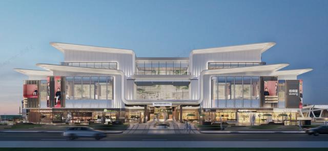 从外部可以看到,目前商场的建筑主体框架已完工,外立面安装基本成型,局部区域仍在进行细节处理。远远望去,整座建筑的水平与垂直线条交织形成简洁的几何框架,呈现出现代简约与科技感深度融合的设计风格。