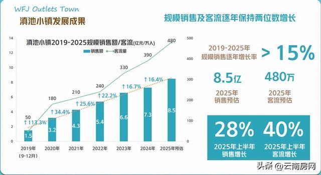 王府井奥莱滇池小镇于2019年开业,总建面约12.8万平方米,定位于以奥莱为主力店的新生活方式融合性休闲购物小镇。小镇开业以来,销售规模与客流年均增长率超过15%,2024年,销售额达7.3亿元,客流达到390万人,今年上半年,销售和客流增长率更是飙高到28%和40%。小镇预估,今年全年的销售额将增长到8.5亿元,客流480万。