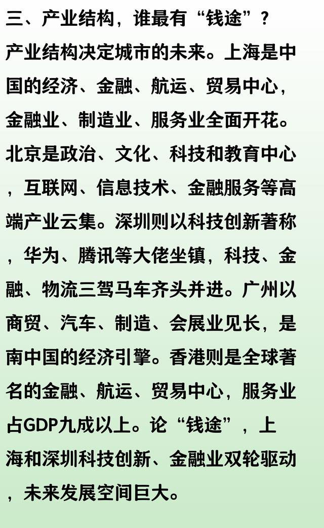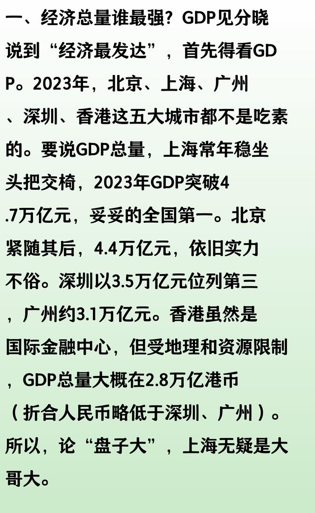 其实这几个城市各有各的厉害,北京是政治和文化中心,上海是金融和航运大哥,香港是国际化窗口,深圳是创新和科技之都,广州则是南方的商业重镇。要说谁最发达,真的是各有千秋,看你怎么定义“发达”。我觉得,不用非得分个高低,毕竟它们撑起了中国的半壁江山,各有风采,你觉得呢?