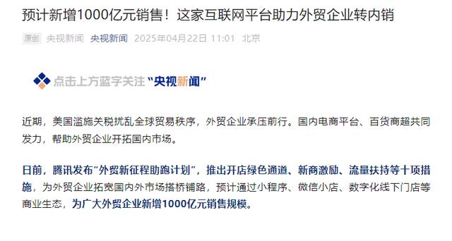 4月17日,腾讯推出“外贸新征程助跑计划”,通过开店绿色通道、新商激励、流量扶持、费率优惠等十项措施为外贸企业拓宽国内外市场搭桥铺路,还要为外贸企业新增1000亿销售规模。