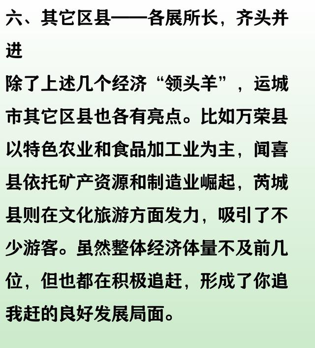 说到运城市,大家最关心的就是哪个区县最有钱。其实,盐湖区一直都是经济实力最强的,毕竟是市政府所在地,发展资源多,企业也多。紧跟着是永济市和河津市,这俩地方工业基础好,GDP一直排在前头。其他县区像闻喜、万荣等,虽然经济增速不错,但整体实力还是比不上前三。