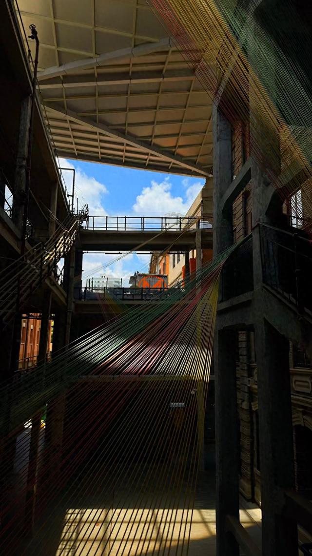 在门口打卡完,跨入平和打包厂内部,又会有别有洞天之感。站在中庭空旷的混凝土地面上,人们的第一反应还是抬头,右侧的整面清水砖墙足有20多米高,嵌有燕子形状的加固金属锚栓,从视线正前方一路斜穿而下,保存完好的钢结构打包运货滑道、粗大的蒸汽阀门和裸露在外的消防管道以及墙上的大字标语,无不向来访者诉说着它的工业历史。
