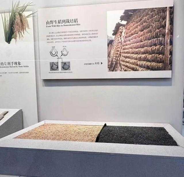良渚博物院展示的现代稻谷和良渚遗址出土炭化稻谷(右)的实物对比