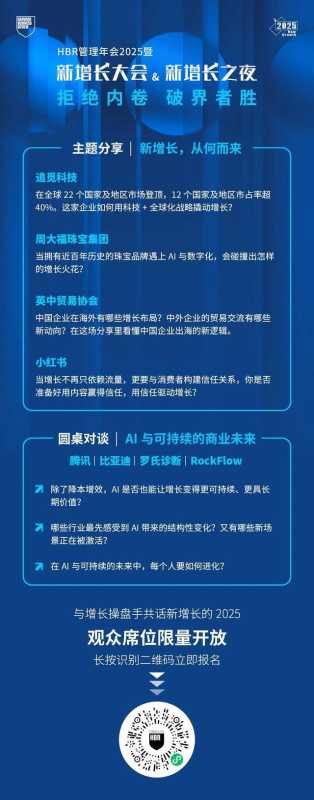 2025年10月31日,HBR管理年会2025暨新增长大会将在北京嘉里大酒店举办。本届年会将以“信任·信念·信心(TRUST · BELIEF · HOPE)”为主题,聚焦组织如何在技术革命与周期震荡中构筑精神锚点,推动穿越周期的可持续增长。