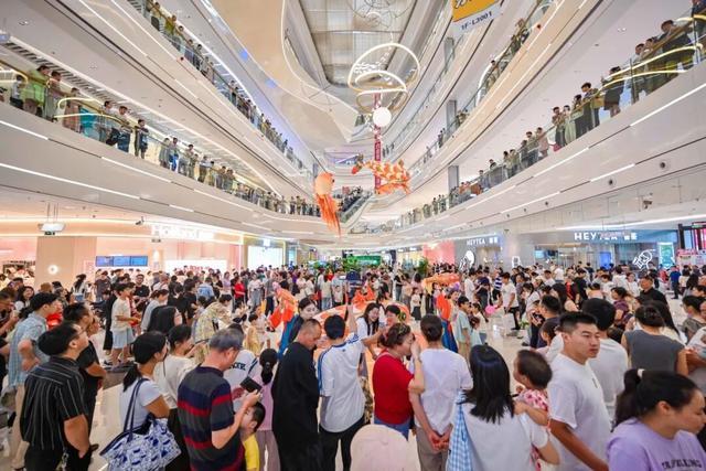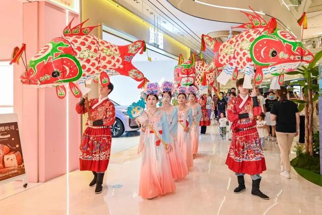 今年国庆期间,一场结合传统文化与现代体验的非遗活动就在项目亮相。8米巨型悬浮飞天锦鲤凌空而起,非遗玲珑鱼灯穿梭于商场之中,配合大鱼入梦鸿运舞等表演,引来不少喜爱这一文化的中年人和颇觉新鲜感的年轻人来到这里打卡。