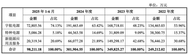 2022年至2025年上半年(以下简称“报告期内”),电科蓝天的宇航电源业务营收分别约为13.45亿元、16.87亿元、19.15亿元及7.28亿元,占主营业务收入的比例分别为53.96%、48.23%、63.42%及74.13%。