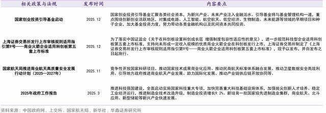 国家航天局商业航天司设立,并印发《商业航天高质量安全发展行动计划(2025—2027年)》,将商业航天纳入国家航天发展总体布局,明确开放国家科研项目、共享重大试验设施,重点支持可重复火箭、智能卫星等核心技术研发。上交所制定并发布《上海证券交易所发行上市审核规则适用指引第9号——商业火箭企业适用科创板第五套上市标准》,为商业火箭企业打开境内资本市场大门,蓝箭航天、星河动力等5家企业已启动IPO进程。