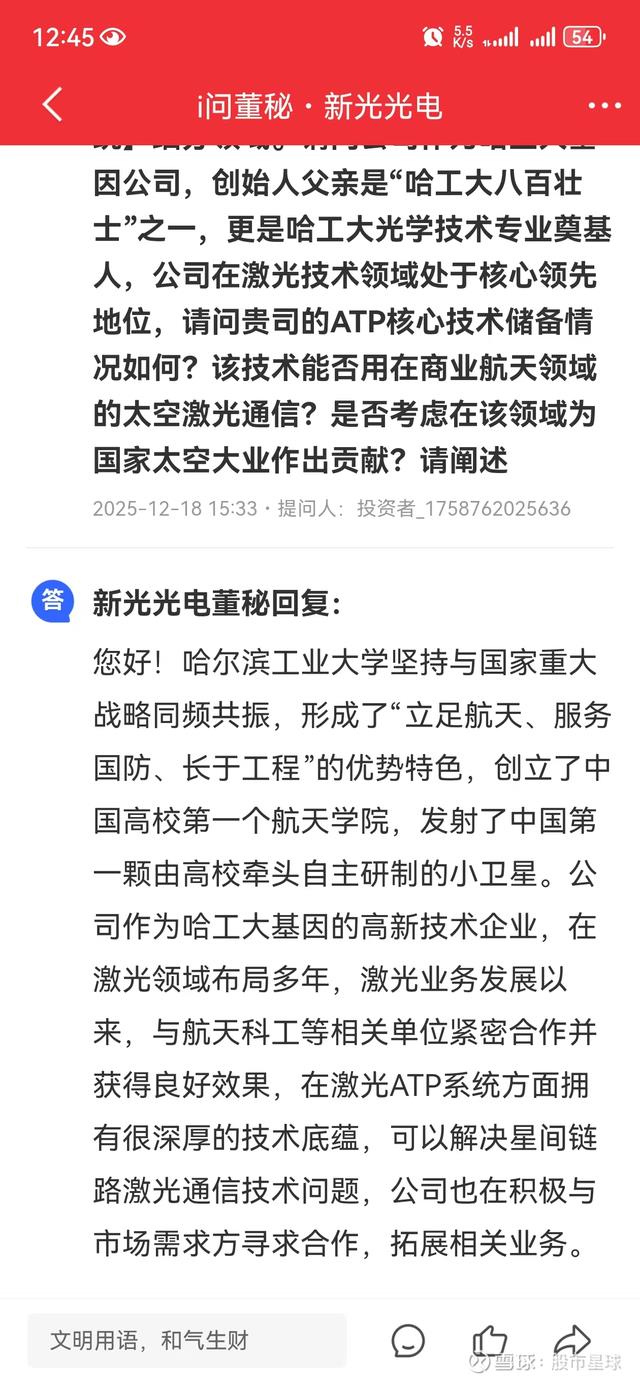 2025年12月,公司在互动平台明确表态:“在激光ATP系统方面拥有深厚技术底蕴,可解决星间链路激光通信技术问题,正积极与市场需求方寻求合作”,这一信号意味着公司已完成技术储备,正式开启商业化对接。