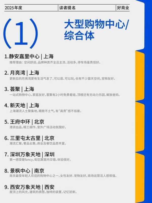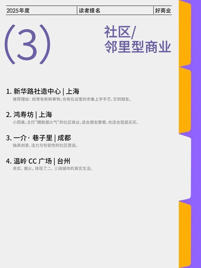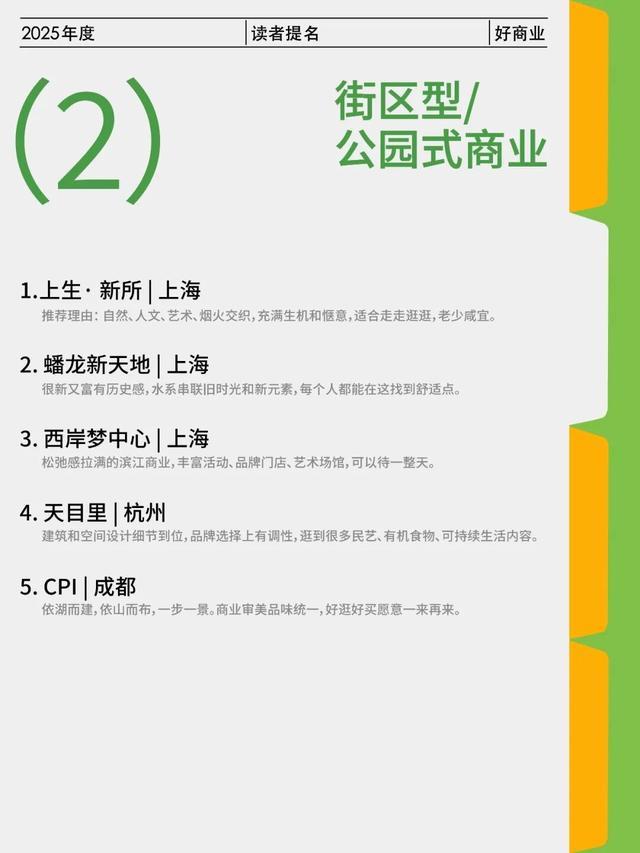 在读者提名的“好商业”中,上生·新所(上海)、CPI(成都)、西岸梦中心(上海)以及蟠龙新天地(上海)为提及最多的四个项目。