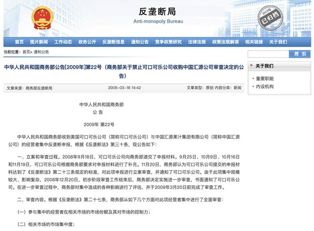 商务部禁止可口可乐收购汇源的决议 图源:反垄断局