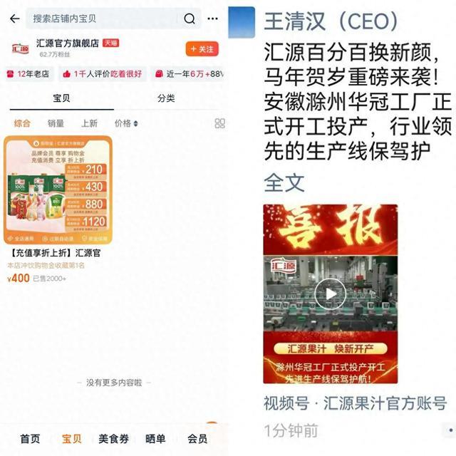 左:只有一款产品销售的汇源天猫旗舰店右:文盛资产委派到北京汇源相关人的朋友圈,提及代工合作图源:网络