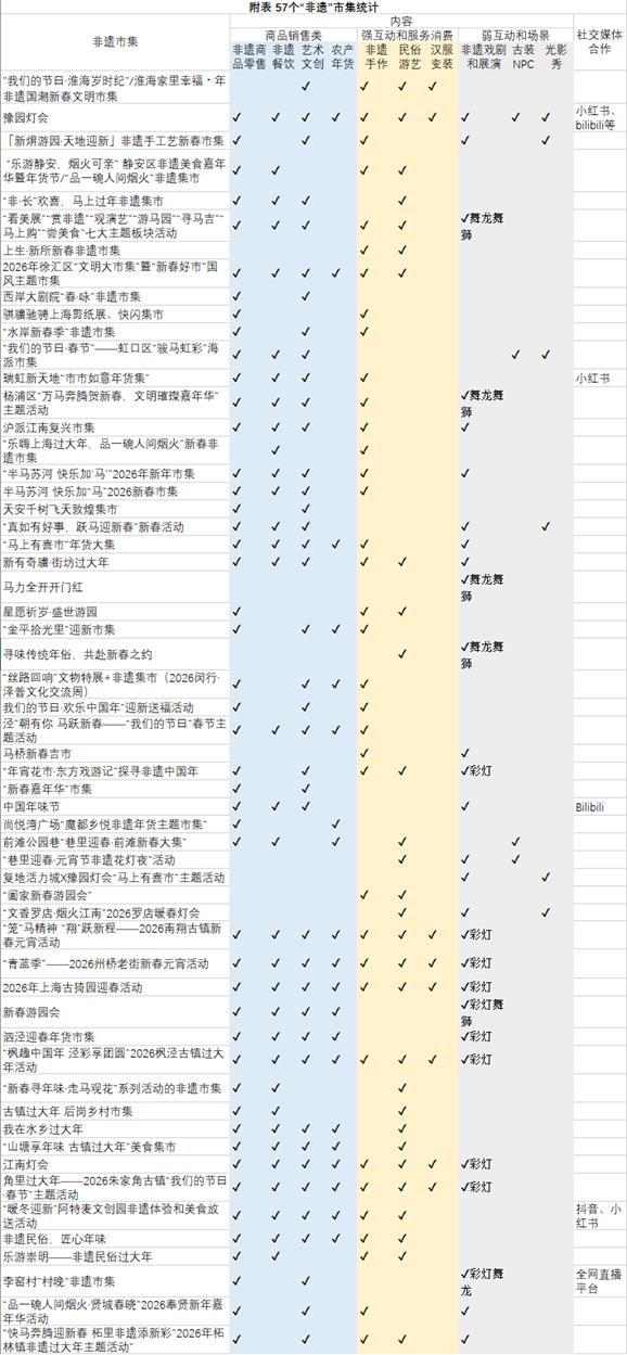 澎湃研究所根据官方新闻报道和16区微信公众号,以“非遗市集”为关键词,整理出2026年1-2月举办或即将举办的57个非遗市集/集市,并在1月31日、2月7-8日两个周末集中参加了8个,采访了4名摊主和17名消费者,试图归纳出供需两侧的画像,并采访中国科学院地理科学与资源研究所副研究员朱鹤,为未来优化“非遗+市集”运营提出建议。