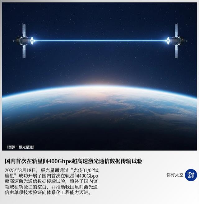 极光星通|400Gbps星间激光通信完成国内首次在轨400Gbps星间激光通信试验,为未来卫星互联网的组网运行提供关键技术验证。