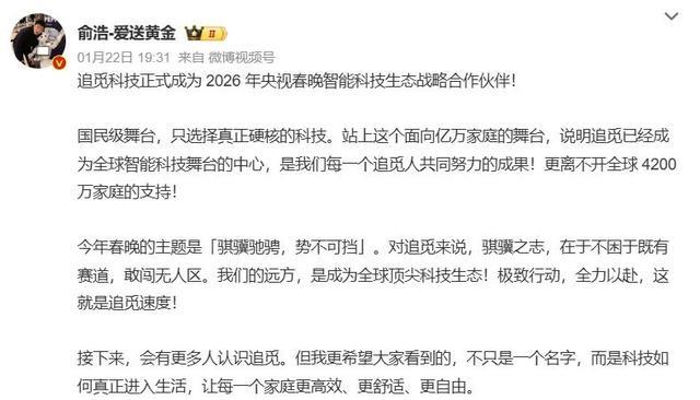 追觅早在1月份就宣布成为2026年央视春晚“智能科技生态战略合作伙伴”,成为春晚史上首个以全生态形态合作的科技企业。据悉,追觅目前核心业务覆盖了智能出行、智能清洁、智能家电、智能厨电、智能影音及户外生活等。