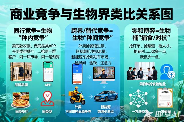 同行竞争 = 生物「种内竞争」卖同款衣服、做同品类 APP、开同类型餐厅……大家抢的是同一群客户、同一块市场、同一笔预算。这是最激烈、最普遍的关系,和生物里同物种抢食抢地盘一模一样,也是商业里占比最高的关系。跨界 / 替代竞争 = 生物「种间竞争」外卖抢餐馆生意、短视频抢电视流量、新能源车抢燃油车市场。看似不是一类,实则在抢你的时间、金钱、注意力,也是隐形但广泛的竞争。零和博弈 = 生物「捕食 / 对抗」抢订单、抢渠道、抢人才、抢专利……你多一点,我就少一点,是商业里最常见的状态。