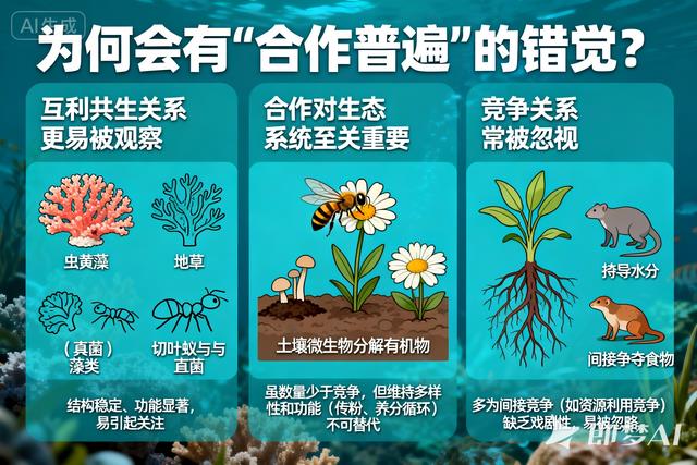 互利共生关系更易被观察:如珊瑚与虫黄藻、地衣(真菌与藻类)、切叶蚁与真菌等,这些关系结构稳定、功能显著,容易引起关注。合作对生态系统至关重要:虽然数量少于竞争,但互利共生关系对维持生态系统多样性和功能(如传粉、养分循环)具有不可替代的作用。竞争关系常被忽视:很多竞争是间接的(如资源利用竞争),不像捕食那样具有戏剧性,容易被观察者忽略。