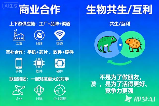 上下游供应链:工厂 + 品牌 + 渠道互补合作:手机 + 芯片、软件 + 硬件联盟抱团:一起对抗更大的对手它们和生物里的「共生」一样:
