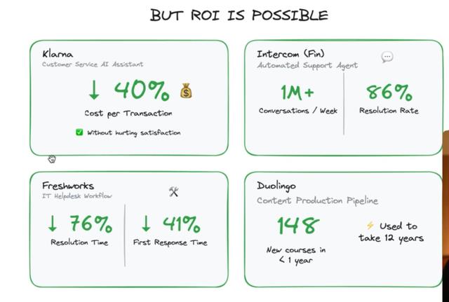 但与此同时,我们也看到了完全相反的案例。Clara报告说他们的AI助手帮助削减了40%的客户服务成本,而且没有降低客户满意度。Intercom每周解决超过一百万次客户支持对话。Freshwork使用AI将IT帮助台的工单解决时间减少了76%。同样是AI,为什么有些公司能获得如此惊人的回报,而其他公司却颗粒无收?