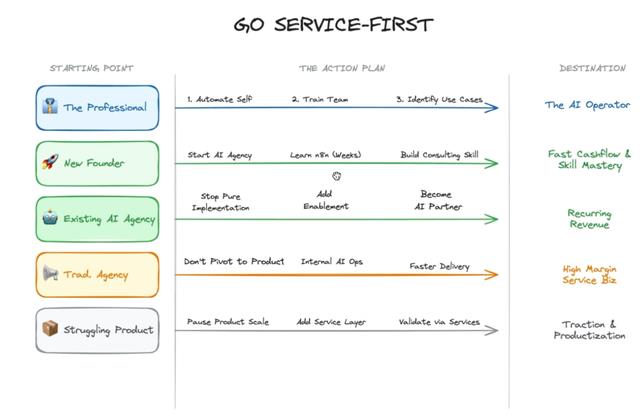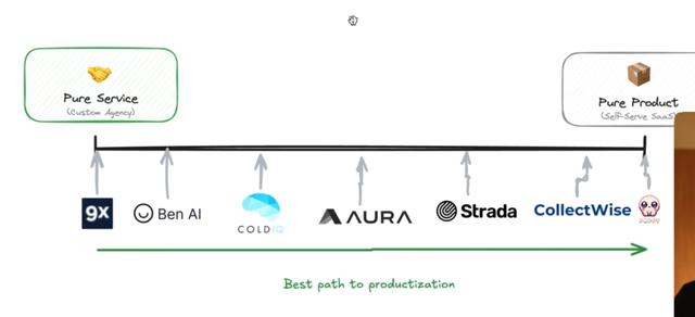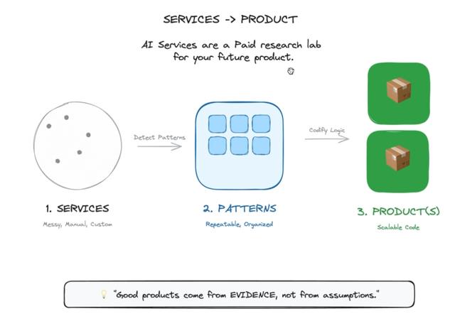 Ben说很多人梦想着构建一个AI产品,保持精简,然后卖给成千上万的人。但对于大多数没有多年创业经验、VC connections(风投关系)或硅谷人脉的人来说,现实是即使提供服务不是最终目标,它们也是今天交付真正ROI的最快路径。而且服务也是产品化的最佳载体。当同样的模式在不同客户之间重复出现时,相似的工作流程调整、相似的集成、相似的培训问题和重复的ROI,它们就成为了应该重复和产品化的信号。