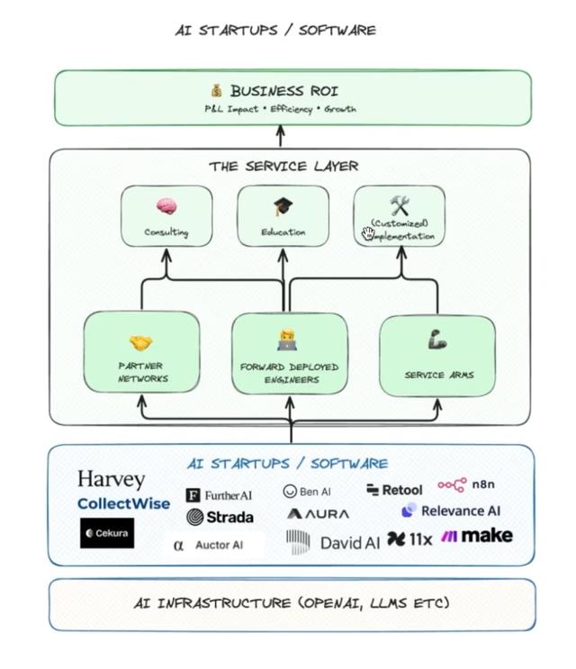 那么成功的AI业务是如何确保这些因素得到满足的呢?Ben的答案很简单也很重要:通常是通过在AI解决方案或AI软件之上添加服务层(service layer)。这就是那个”无聊”但极其有效的商业模式的核心。我们看到所有类型的成功AI业务,使用AI原生软件的企业,都在越来越多地提供咨询、教育和定制实施的组合。