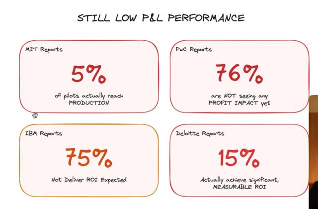 Ben在视频中提到了一个令人震惊的数据对比。虽然ChatGPT的使用率在飞速增长,企业也在疯狂尝试各种AI解决方案,但真正能看到商业价值的却少之又少。根据MIT的研究,在供应商销售的AI解决方案中,只有5%的试点项目最终进入了生产环境。Deloitte(德勤)发现只有15%的组织表示他们从AI中获得了显著的、可衡量的ROI。PWC(普华永道)报告显示76%的企业还没有看到利润影响。这些数字实在太糟糕了。