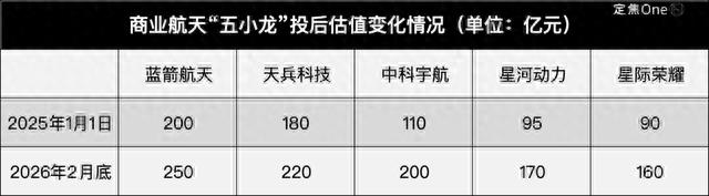 「定焦One」结合多位参与商业航天一级市场融资的投资人所提供的信息,五家公司在今年2月底的投后总估值已经至少达到1000亿元,一年多时间增长超325亿元,平均每家的估值增加65亿元。