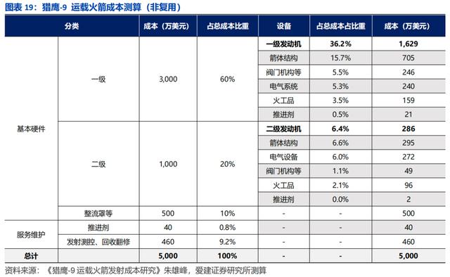 如果把视角放大到整枚火箭,一枚典型运载火箭通常包括一级火箭(负责在发射初期提供最大推力,把火箭送出大气层)、二级火箭(在更高空继续加速,将卫星精入预定轨道)、整流罩(卫星外部的保护壳,在进入太空后会被抛弃)等,根据爱建证券测算,以猎鹰9非复用情况下5000万美元一次的发射成本为参考,一级火箭成本占比60%,二级火箭占比20%。