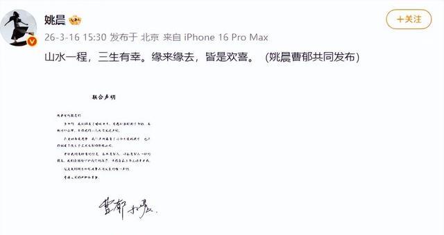2026年3月16日姚晨和曹郁发那纸声明时,人家早就不是一条船上的夫妻了。这哪是感情破裂,这是合伙人拆伙完成后的正式通知。